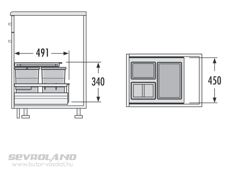 Fiókba szerelhető, szelektív hulladék tároló szett, 3 db kivehető, műanyag tárolórekesszel. 450 mm-es szekrényszélességhez, 500 mm mély névleges hosszúságú fiókba illeszkedő kerettel. Praktikus fogantyúkkal ellátott szemetesvödrökkel, összesen 34 liter tárolókapacitással. A vödrök felett kihúzható bűzzáró fedél található, mely pakolható tárolórekeszekkel van kialakítva a könnyebb áttekinthetőséghez. (Fontos: külön fiókot kell hozzá rendelni/készíteni, az nem a csomag része.)