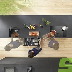 A fiókokban elhelyezett Blum osztórendszerek biztosítják a jó láthatóságot és a könnyű hozzáférést. Az evőezközök rendszerezhetőségében nagy segítséget jelenthet az ORGA-LINE evőezköztartók alkalmazása is.