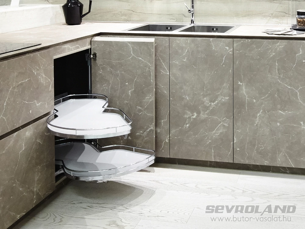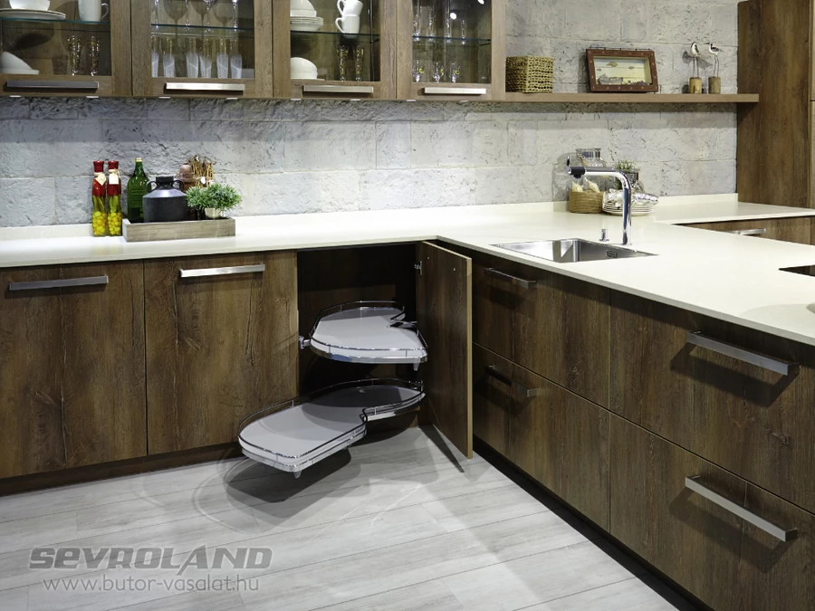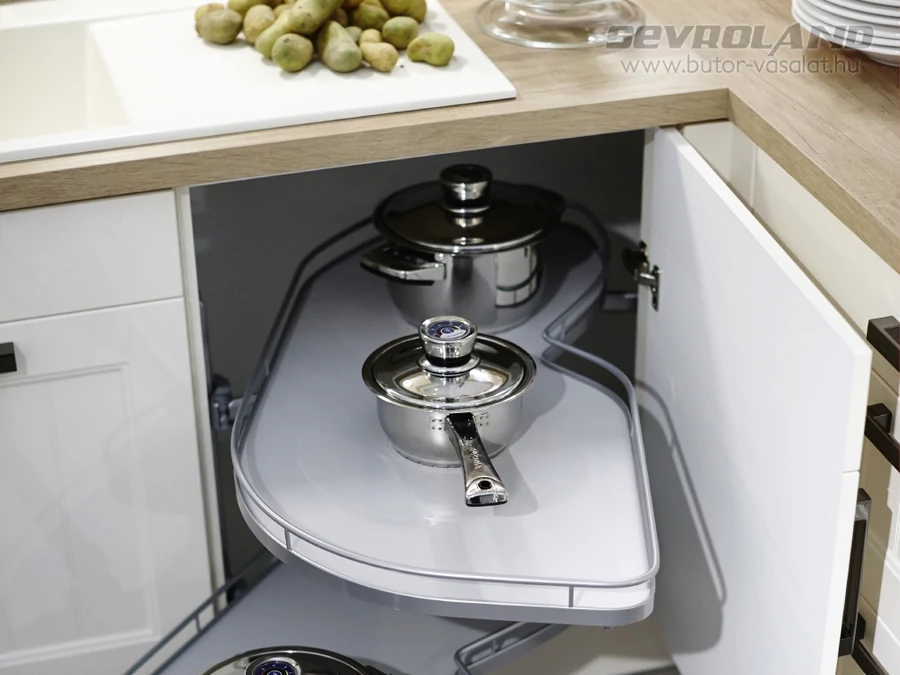 A LeMans II sarokvasalat rendszer a magas minőségű alapanyagoknak és a masszív kialakításnak köszönhetően kiemelkedően jó teherbírással rendelkezik. Polconként akár 25 kg terheléssel is finoman és lágyan mozog, megőrizve stabilitását. Sok tányér, nehéz tálak vagy esetleg konyha robotgép? Nem probléma...