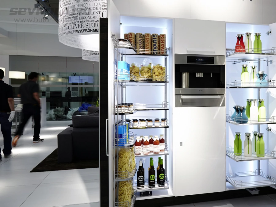 A Tandem kamravasalat rendszerrel a Kesseböhmer egy praktikus, jól hozzáférhető tárolási megoldást készített, különleges, dupla polcos kialakítással. Az ajtón egy sor értékes tárolórekeszben áttekinthetően rendezheti el a gyakran használt kellékeket. A rácsos kialakítás erős, megbízható tárolást biztosít, megakadályozva az apróbb tárgyak kiesését. A hátsó polcok az ajtó kinyitásakor előre gördülnek, így könnyen eléri a hátsó tárgyakat is. Jó áttekinthetőség és könnyű hozzáférés - a TANDEM kamravasalat rendszerrel élvezheti minden nap a pakolást...